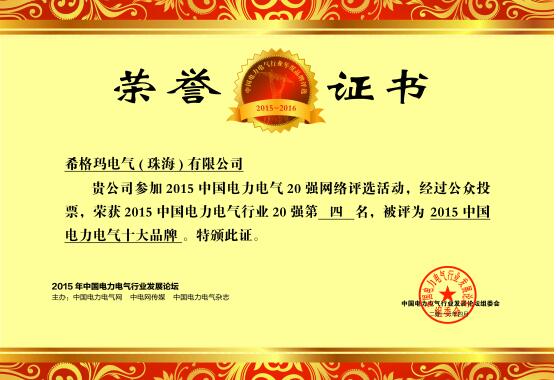2、 热烈祝贺九州网页版荣获 2015中国电力电气20强网络评选活动第四名的成绩,被评为“2015中国电力电气十大品牌”称号